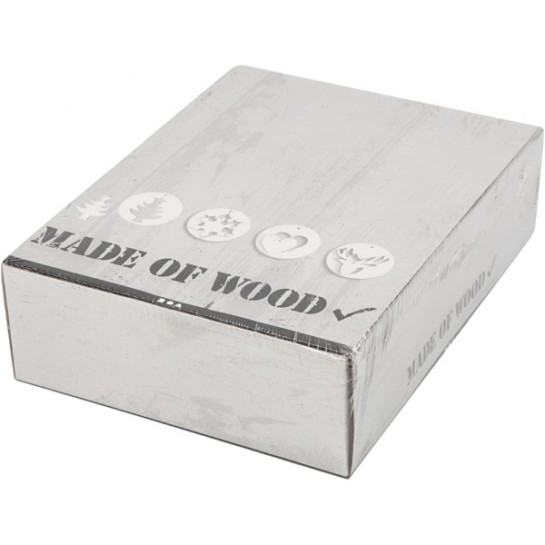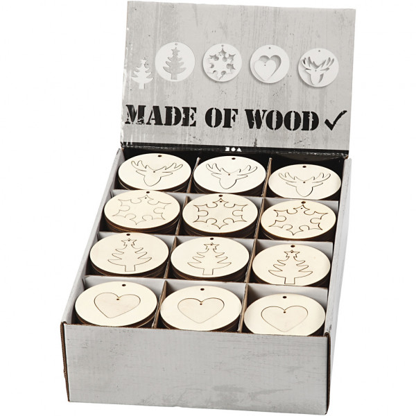 An assortment of 2-in-1 decorations in 4 different designs,containing a circular disc of light wood which has a removable inner piece with a Christmas theme. Both have a hole for hanging.