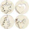 An assortment of 2-in-1 decorations in 4 different designs, containing a circular disc of light wood which has a removable inner piece with a Christmas theme. Both have a hole for hanging.
