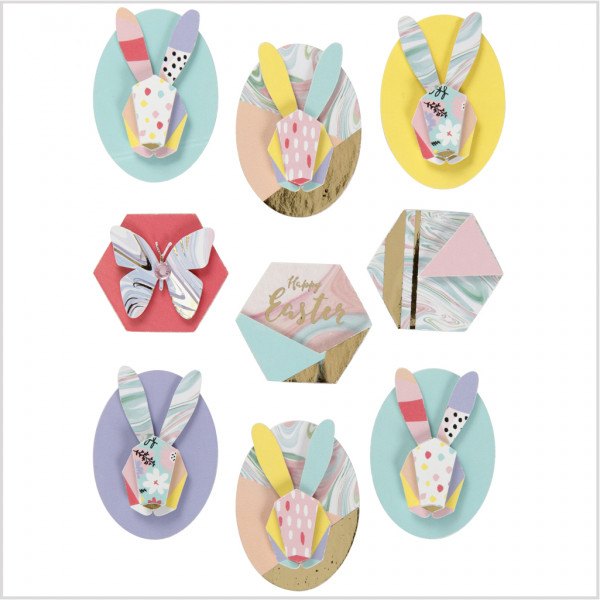 Detailed 3D sticker designs to use in multiple layers. Each is carved from thick paper with pads on the back.