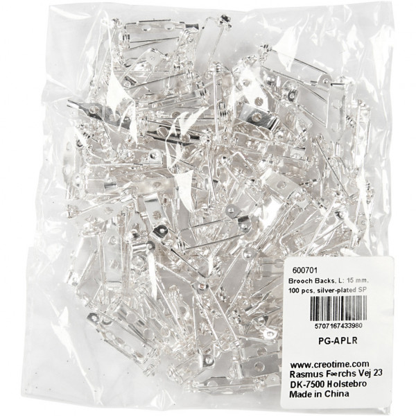 Brooch Backs, L: 15 mm, silver-plated, 100pcs
