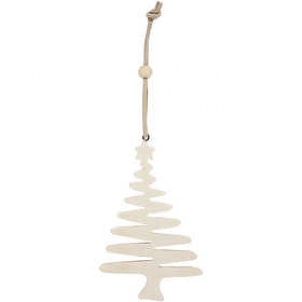 Modern Christmas tree of bright wood - with eye and string for hanging.