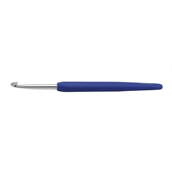 Ergonomic crochet hook of aluminum, with soft touch plastic handle.
