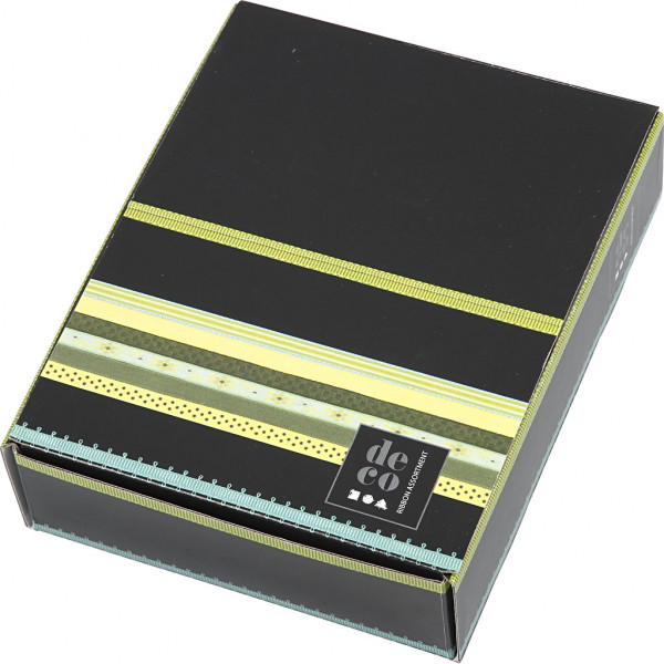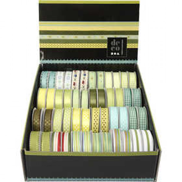 Range of decorative ribbon in display box.