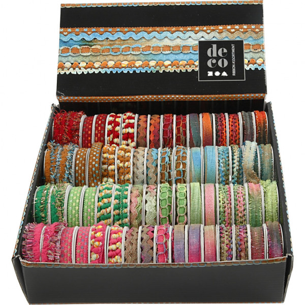 Range of decorative ribbon in display box.