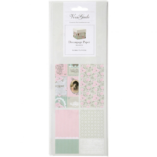 An assortment of single-sided, semi-transparent decoupage paper with prints from Vivi Gade.