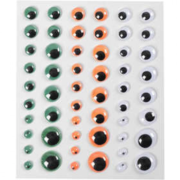 Googly Eyes, D: 6+8+10+12+15 mm, 54 pc, 1 sheet, green, white, orange [HOB-28994]