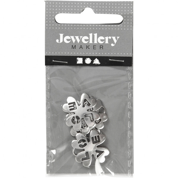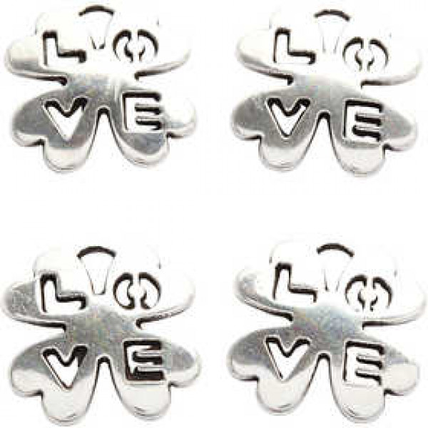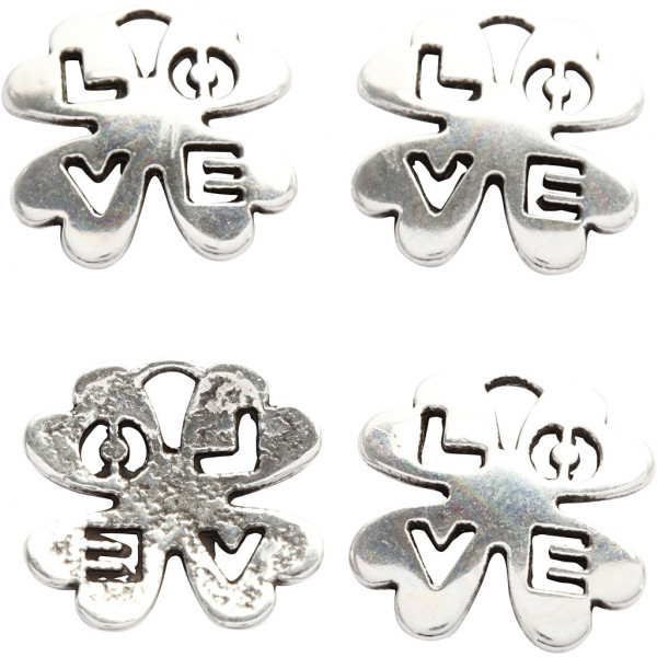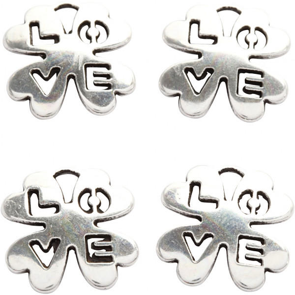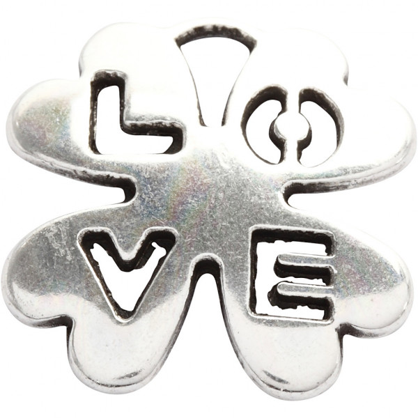 Metal pendant formed as a four-leaf clover, which is cut out in each leaf with a letter of the word 'love'.