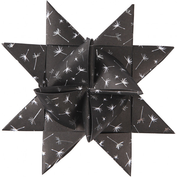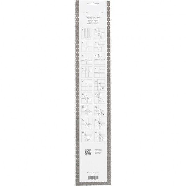 An assortment of two-dimensional multi-coloured paper strips with 2-sided paper in a total of four different designs with 2-sided printing and fine details in metallic foil. Diameter indicates the finish stars' size. Instructions included.