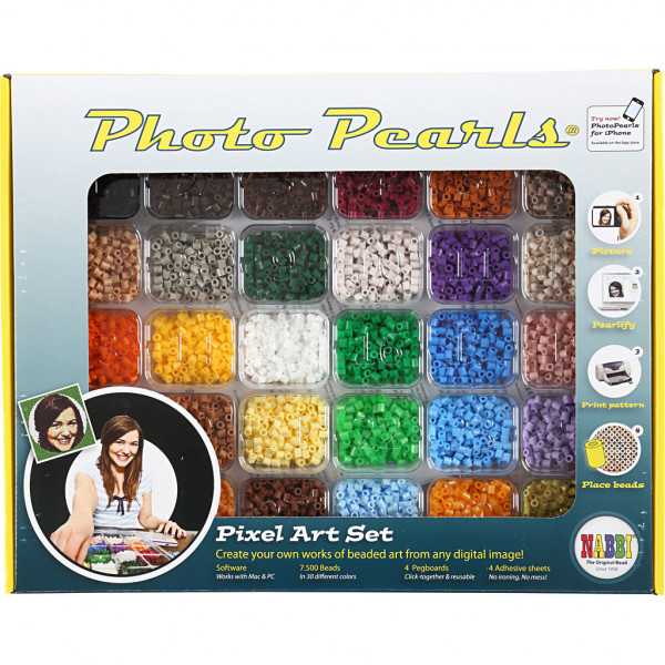Content: 15000 Nabbi PhotoPearls - 30 colous in box with color codes on the lid, 4 pegboards (15 x 15cm), 4 self-adhesive sheets.