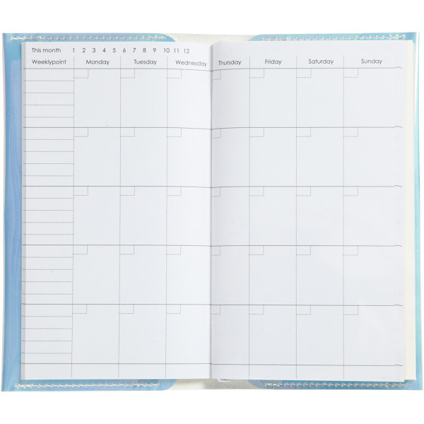 Contents: Calendar folder, weekly leaflet (34 pages), dot / dots notebook (32 pages). The weight of paper is 100 g / m2.