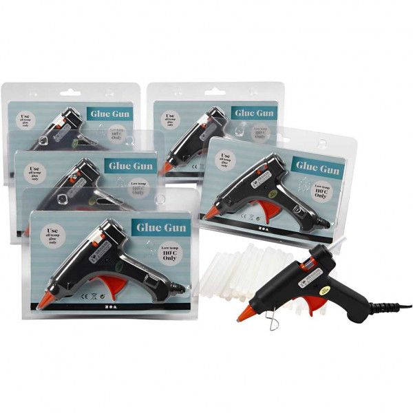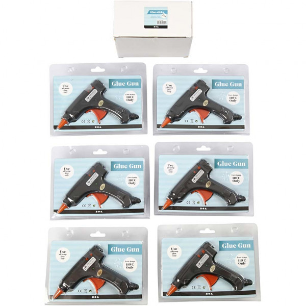 Pack with 6 glue guns and 200 glue sticks.