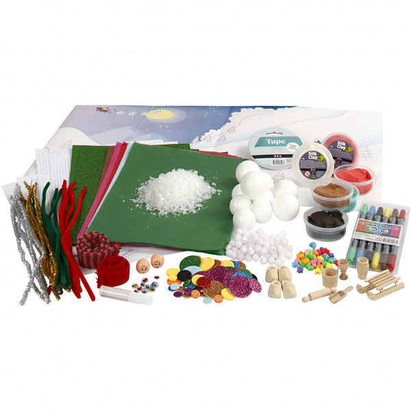 Content: knitted tube, pom-poms, heads, clogs, Silk Clay, EVA foam, sledge, balls, googly eyes, snow, cross stich card, tissue paper and markers.