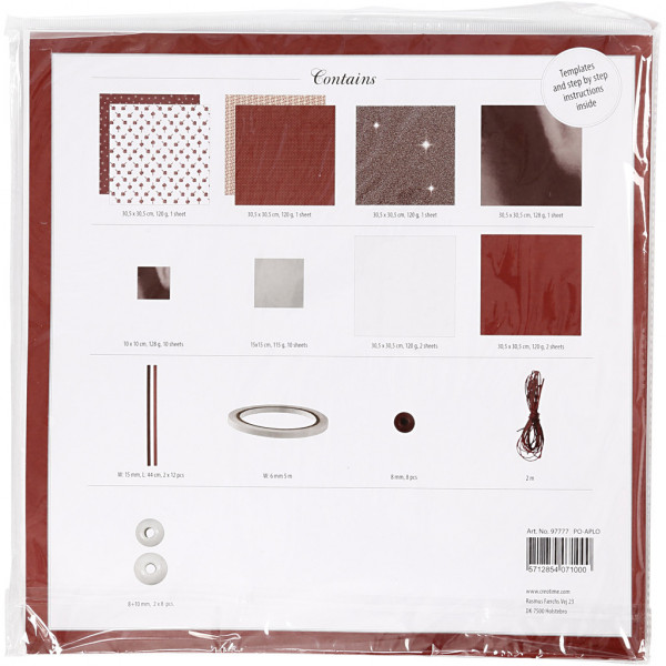 5 assorted sheets of design paper, 4 assorted sheets of plain paper, 22 assorted sheets of origami paper, 24 assorted paper star strips, 16 assorted glass and wooden beads, 8 x 2m waxed cotton cord, 5m double-sided adhesive tape.