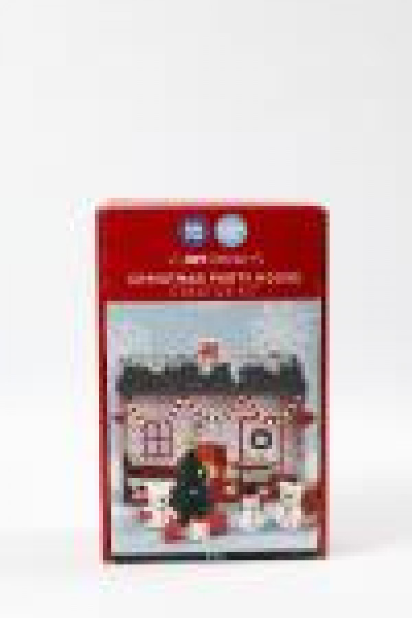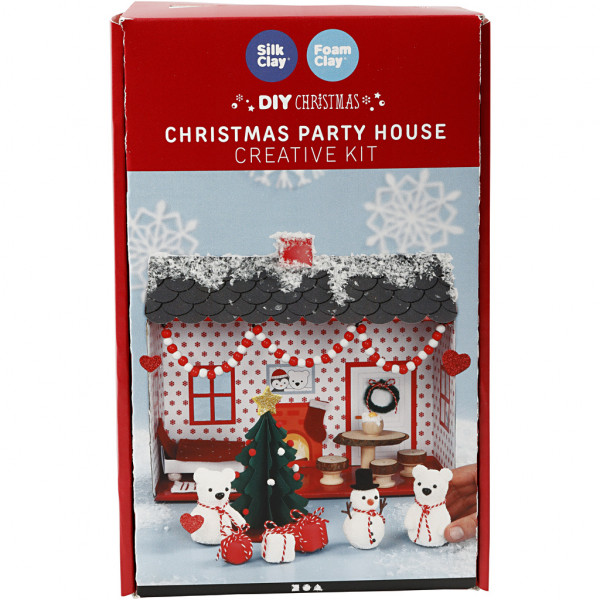 Content: Foam and Silk Clay in several colors, styrofoam, glitter glue, eyes, snout, felt, string, beads, pieces of wood, snow, pipe cleaners, hearts, outstands. parts in cardboard, nose, hats and arms. Sheets for casing of box and roof as well as gu.
