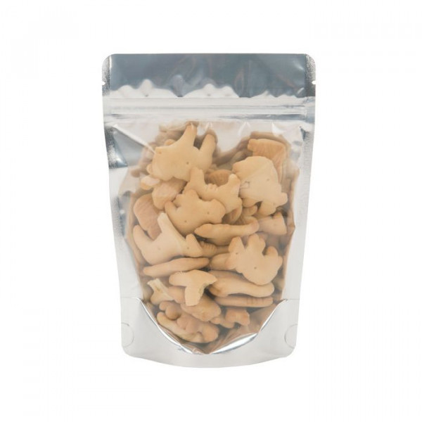 Our ZBGB3 Stand Up Zipper Pouches come in a black finish and have a clear front panel with a silver interior. These shiny pouches create a high-end look for fancy snacks and ordinary grains alike. At  130 x 80 x 205mm, these pouches have a usable space of 4 ounces/57 grams (based on whole coffee beans). A laminated blend of materials provides a durable package and built-in high barrier protection against moisture and odors. An airtight resealable zipper keeps flavors and aromas inside the bag. Ideal for coffee, spices, chips, jerky, and more. Tear notches are located above the zipper for easy access to your product. These pouches look great on retail shelves.